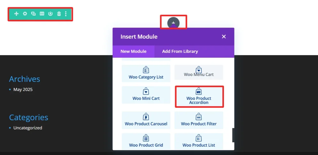 Install our Divi WooCommerce product accordion module.
