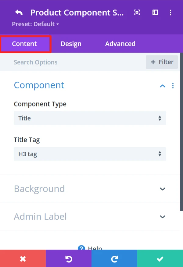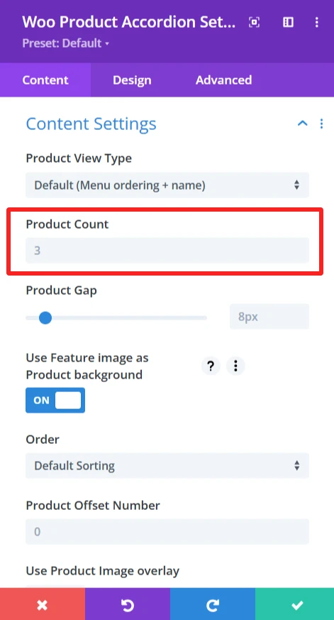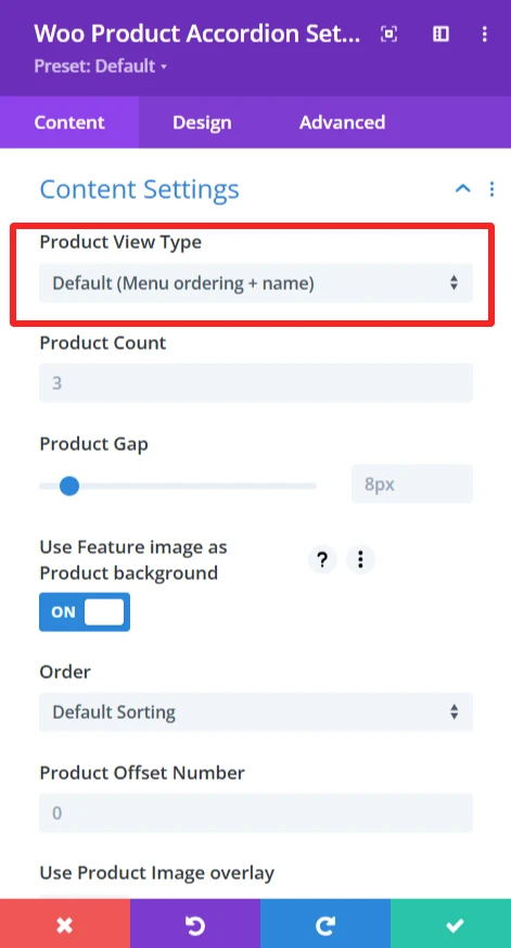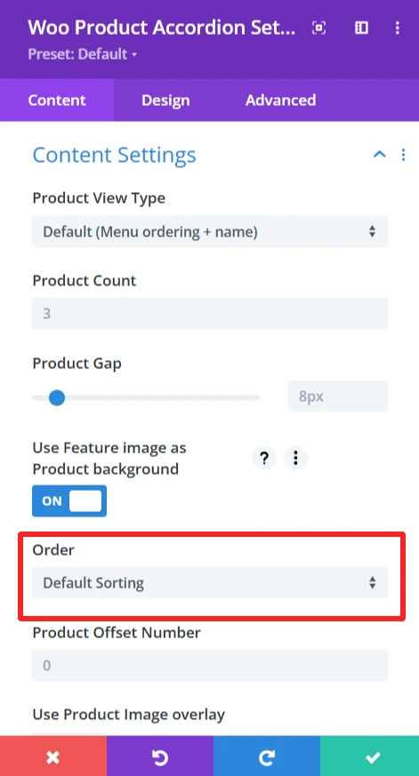The content tab offers an extensive amount of options to control how products are displayed in the product accordion. This section is made to be customizable in layout and sorting.