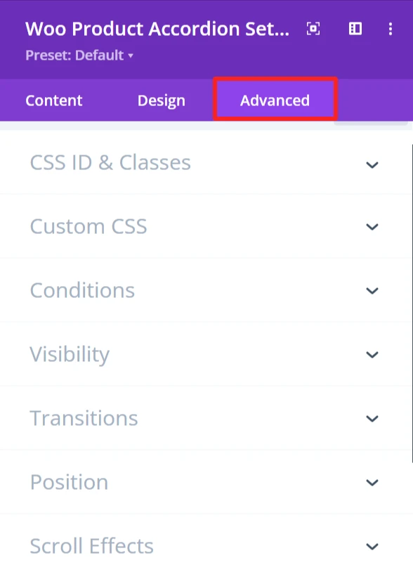 The Advanced section of the Woo Product accordion module offers more customization for those who’d like to have more control over the behaviour and visibility of the product accordion, as well as how the user will interact with it. These are mostly for those who know a bit of web development or who want to make fine-tuned adjustments. It offers options such as adding CSS IDs or classes, using its own custom CSS for design adjustments, and setting conditions for when the accordion is displayed.