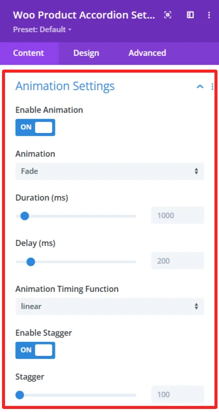 Enable Stagger: If activated, each accordion item animates with a delay between them instead of all at once.