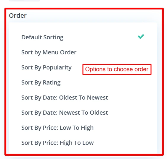 Functionality: This option sorts products based on different parameters like product name, custom menu order, etc.
