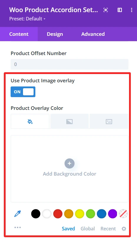 Functionality: It allows to apply colored overlay on the product image at the accordion. It’s usually utilised for hover effects or to improve the colour contrast of product details.