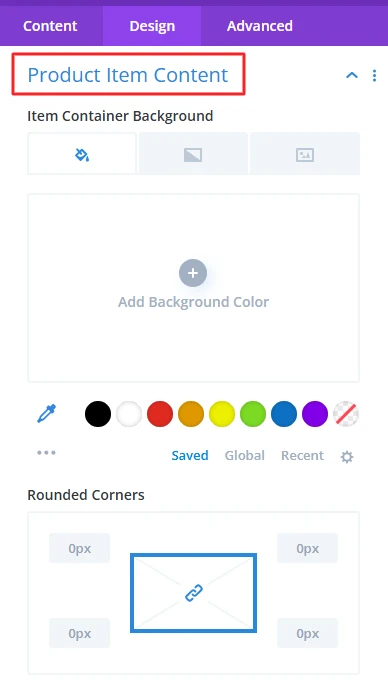 Product Item Content: it is used for customization item container background, rounded corners, and its border style, width, color also used to give a box shadow in the item container.