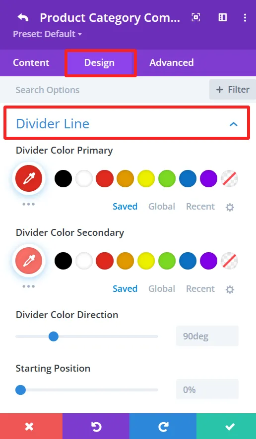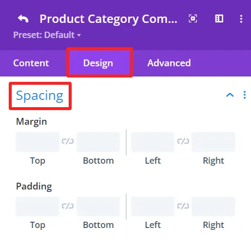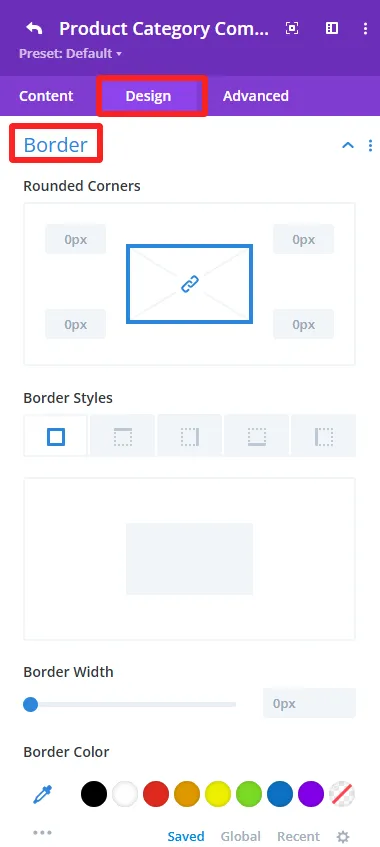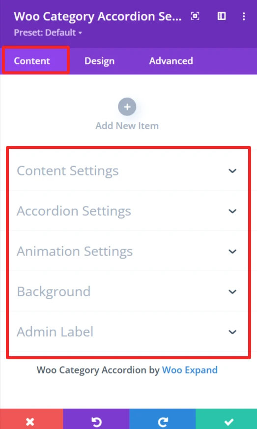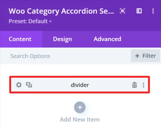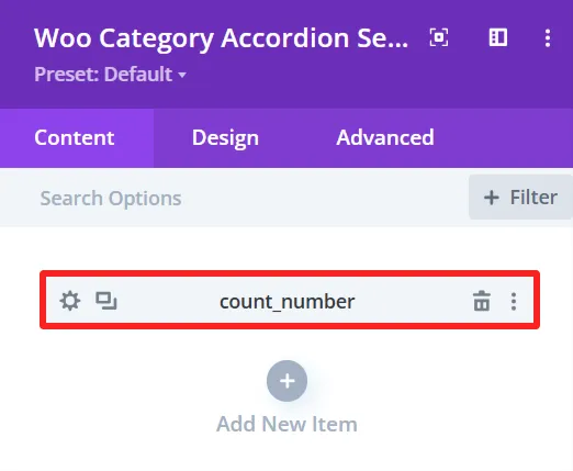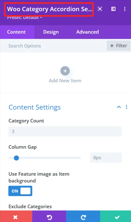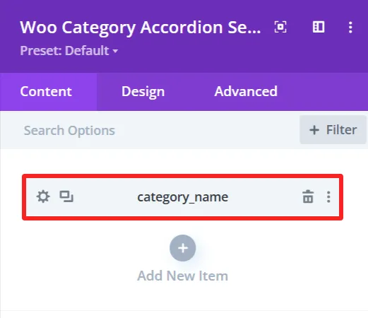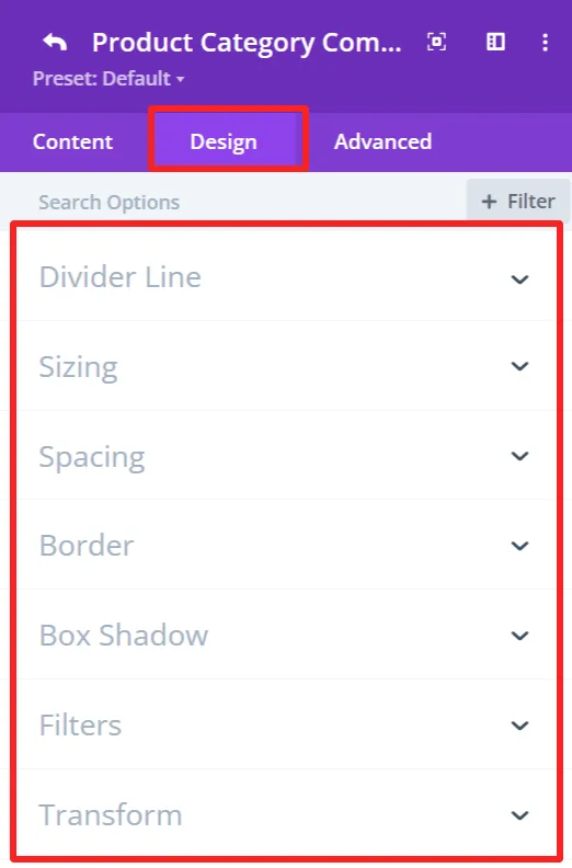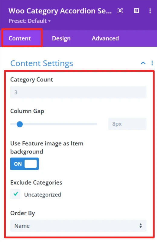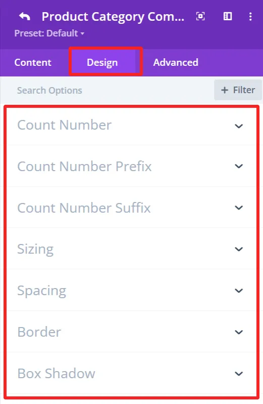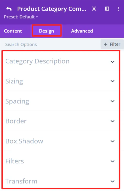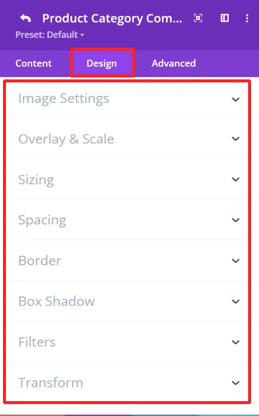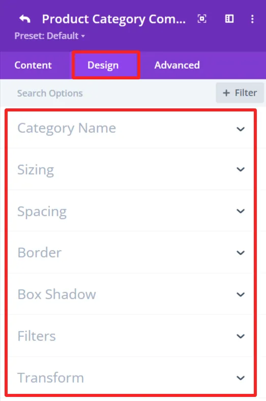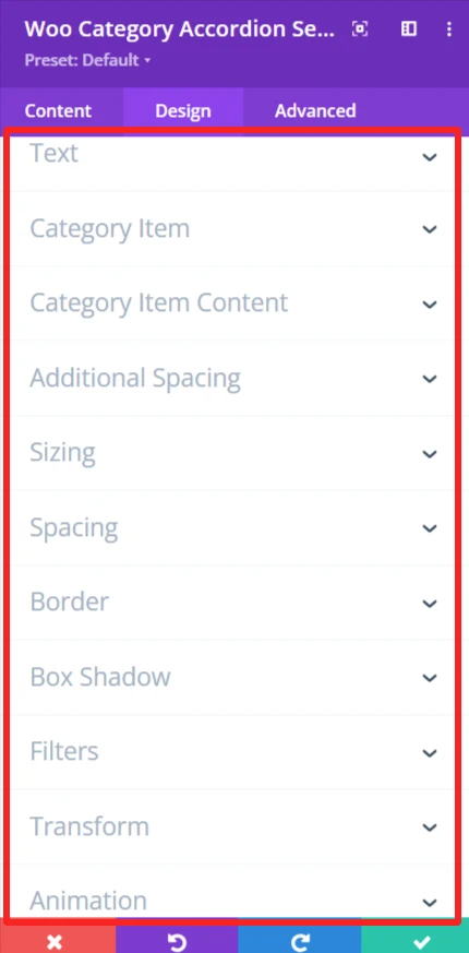 The Design tab in the Woo Category Accordion module lets you customize how the category accordion appears on your site. You can adjust the look and feel of the accordion and its items.