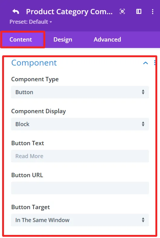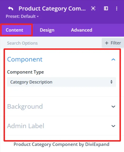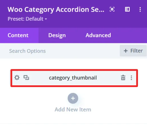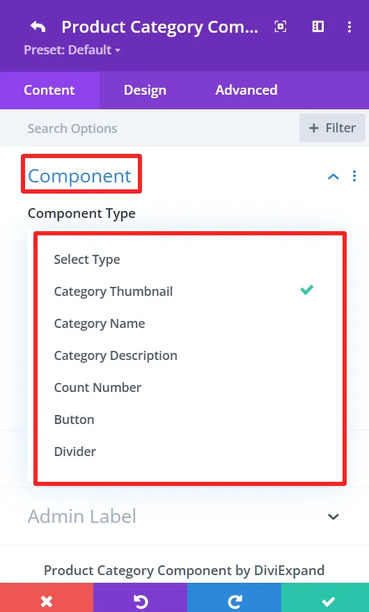The “Component Type” dropdown prompts you to select the component to be the accordion item. You can select component type from the available options,  including Category Thumbnail, Category name, Category description, etc.