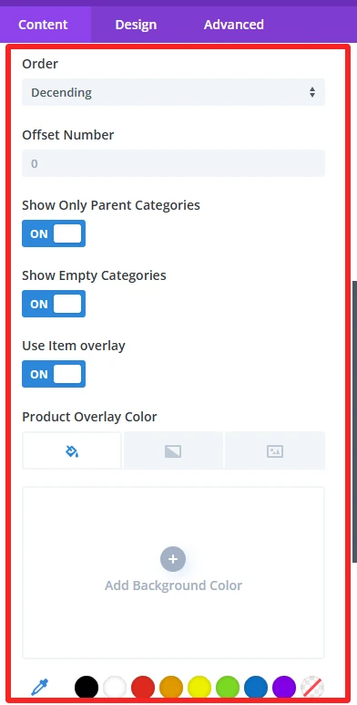 Product Overlay Color: In this setting, you can select a color for the overlay effect of the category items.