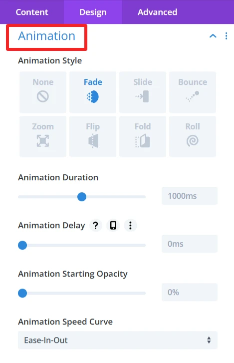 Duration (ms): The speed slider controls the length in milliseconds of the animation. Use a longer time here to slow down the animation, and a shorter time to speed it up.