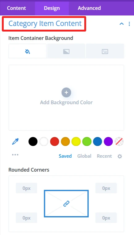 Category Item Content: It is used for customization item container background, rounded corners, and its border style, width, color also used to give a box shadow in the item container.