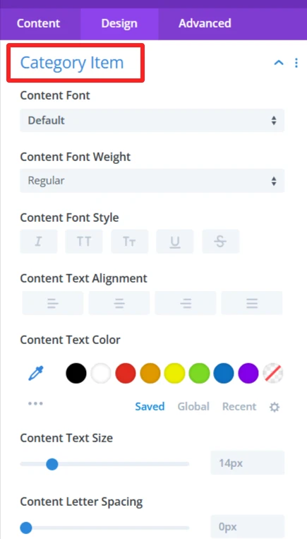 Category Item: Allows customization of the appearances of individual category items, Such as content font, weight, style, etc.