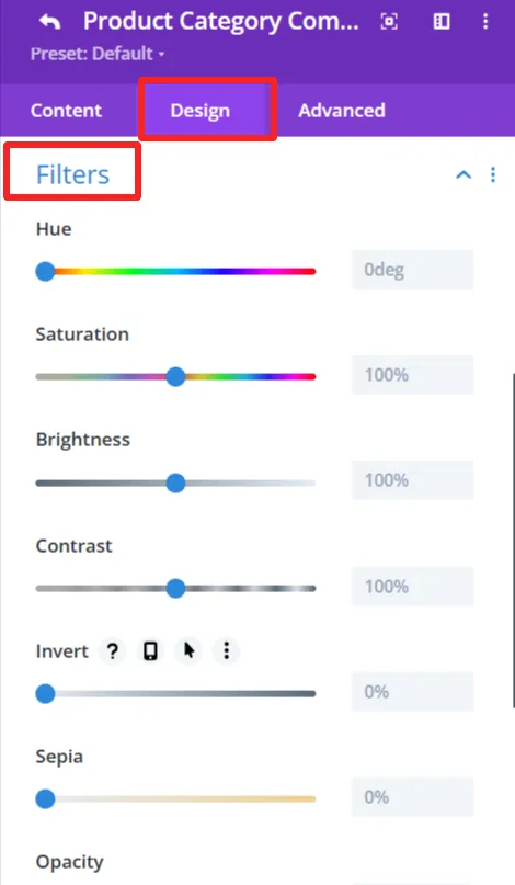 Filters Effect: Hue, brightness, and opacity sliders to make the category accordion more appealing.