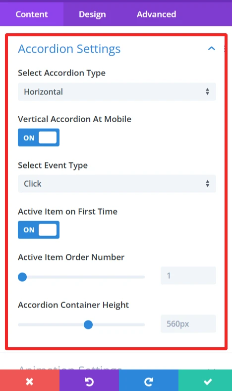 Accordion Container Height: You can set the height of the accordion container with this option. You can set up the height( in pixels) to tweak how the accordion fits into your design. This keeps the accordion container consistently presented.