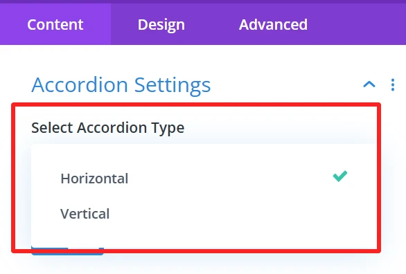 Select Accordion Type: Here you have the possibility to decide between two types of accordion display: Horizontal and Vertical. Horizontal places the accordion items next to each other, while Vertical is a stack of one on top of the other.