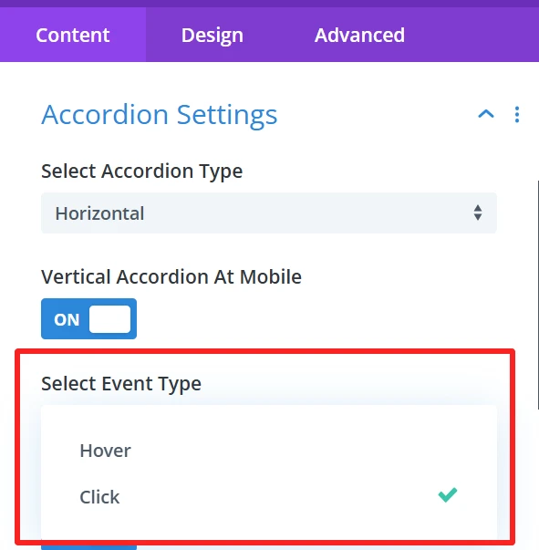 Select Event Type: This one allows you to set how the accordion items will be opened. You can select event type, hover, or click.