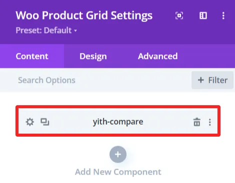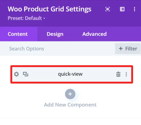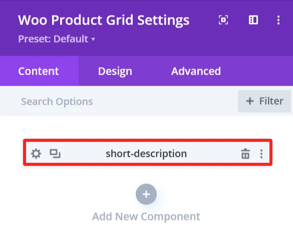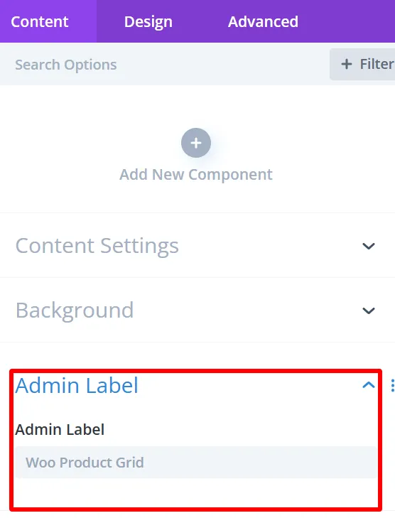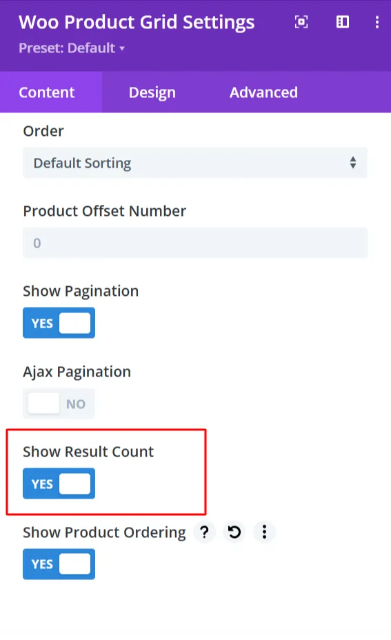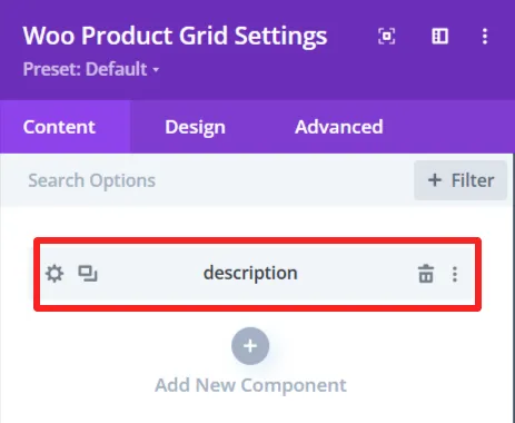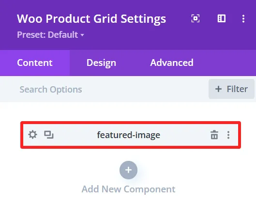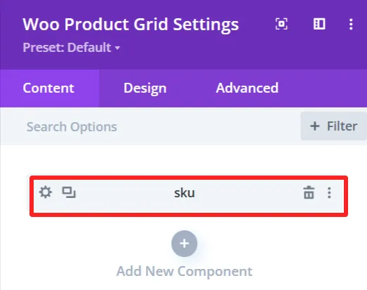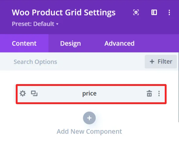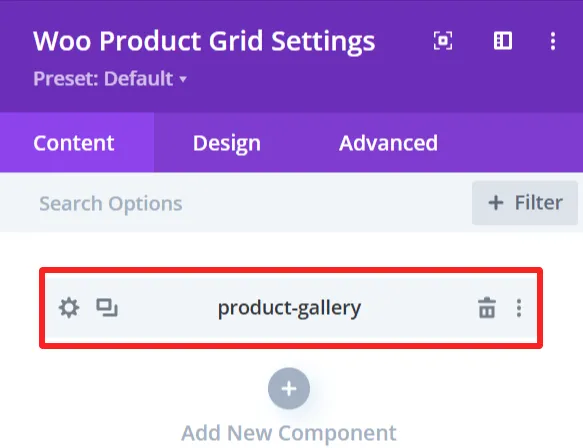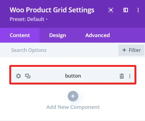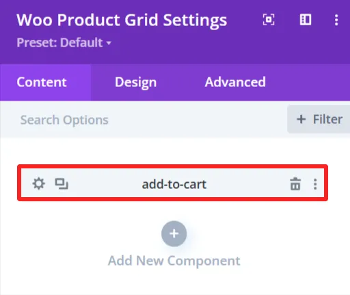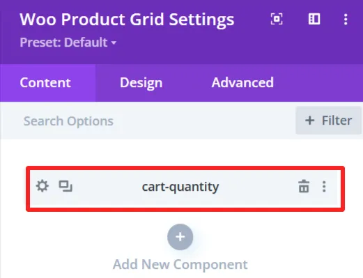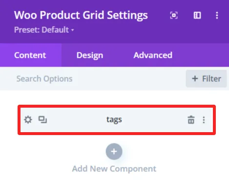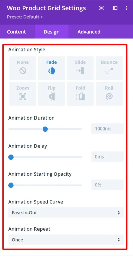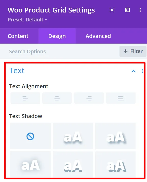 The Design tab in the Woo Product Grid module lets you customize how the product grid appears on your site. You can adjust the look and feel of the grid and its items.