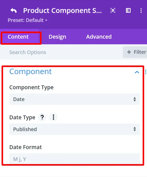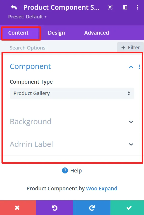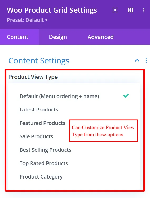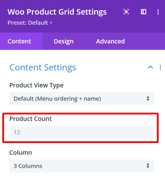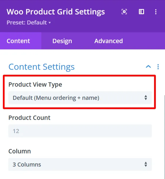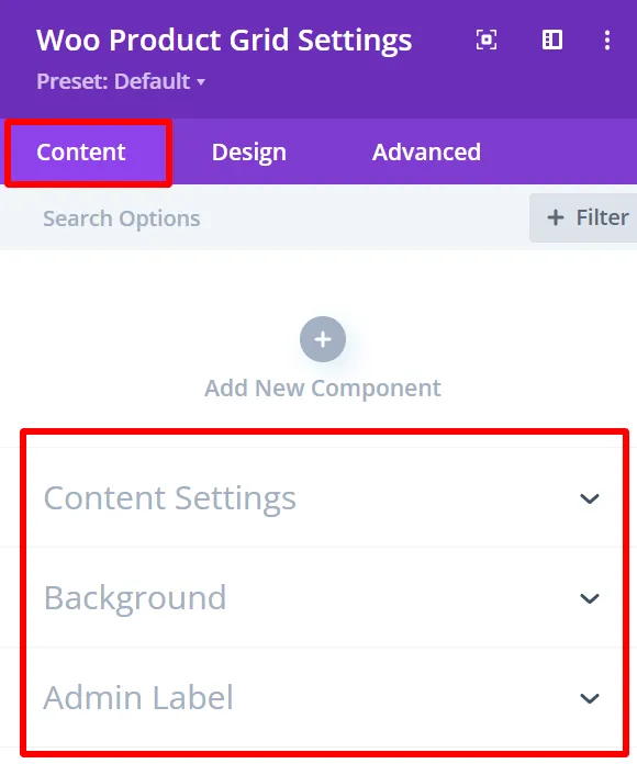 The content tab offers an extensive number of options to control how products are displayed in the product grid. This section is made to be customizable in layout and sorting.