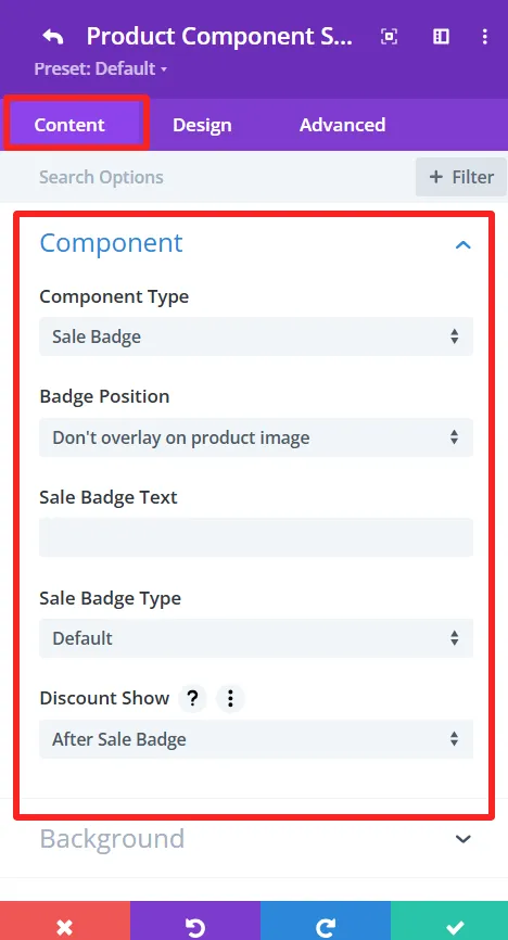 Component Type: Choose Yes or set the component type to “Sale Badge” to make the badge functional.