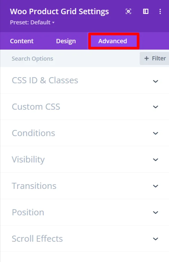 The Advanced section of the Woo Product Grid module offers more customization for those who’d like to have more control over the behaviour and visibility of the product grid, as well as how the user will interact with it. These are mostly for those who know a bit of web development or who want to make fine-tuned adjustments. It offers options such as adding CSS IDs or classes, using its own custom CSS for design adjustments, and setting conditions for when the grid is displayed.