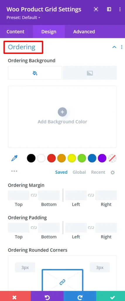 Ordering: It is used for customization of ordering background, margin, padding, rounded corners, and its broader style, width, and color, also used to give box shadow in ordering.