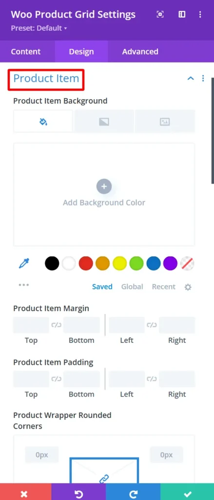 Product Item: it is used for customization product items’ background, margin, padding, product wrapper rounded corners, and its border style, width, color also used to give box shadow in product items.