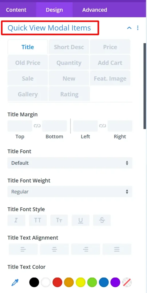 Quick View Modal Items: Set the items that are being displayed inside the quick view popup. You can display the product image, price, description, or any other optional information inside the modal.