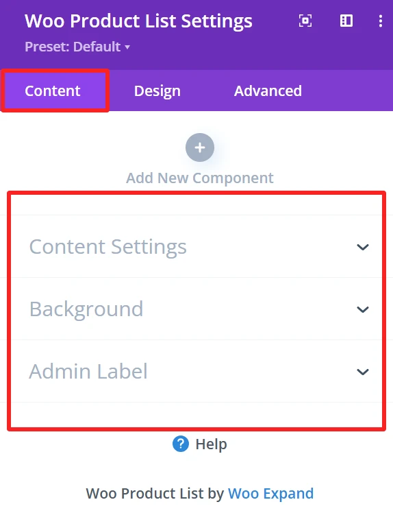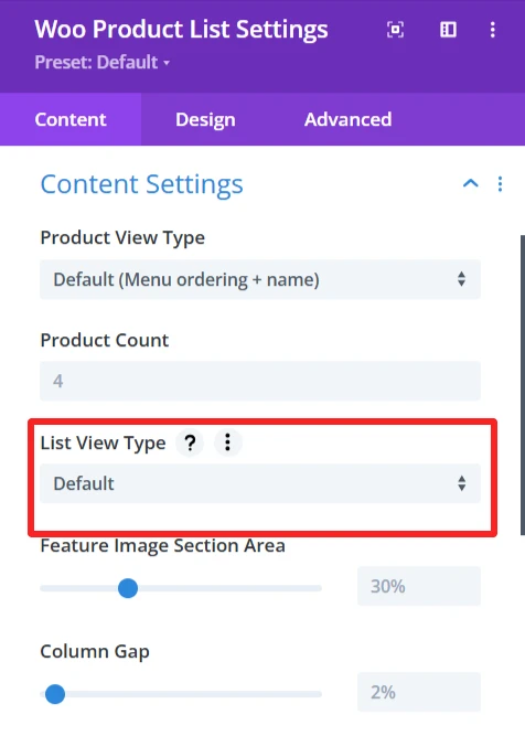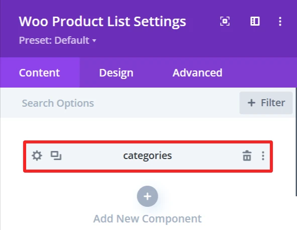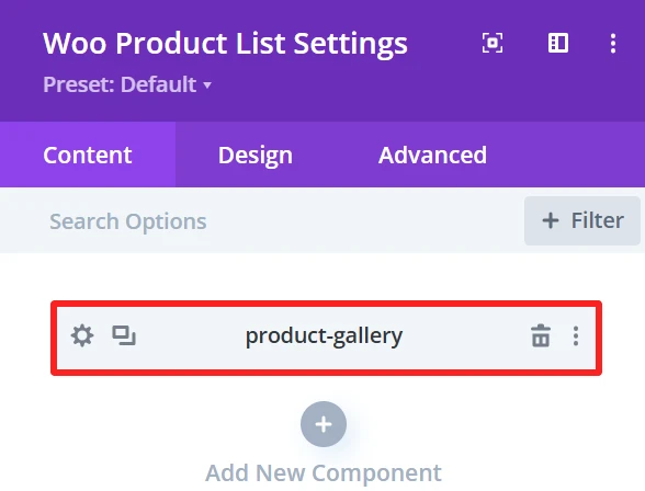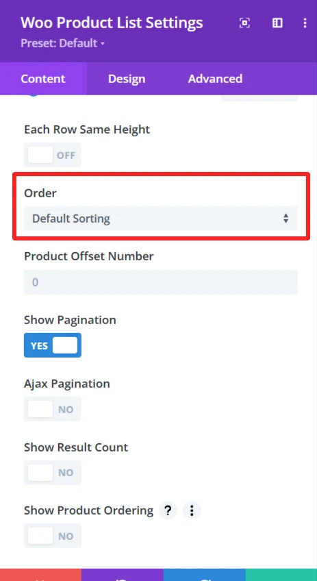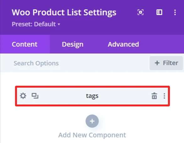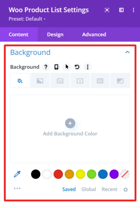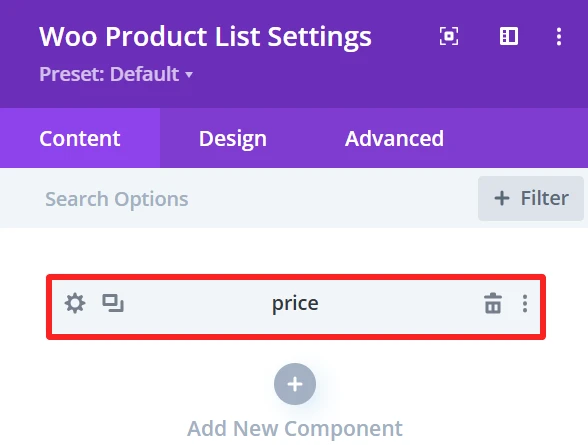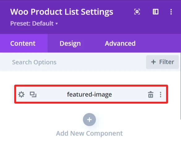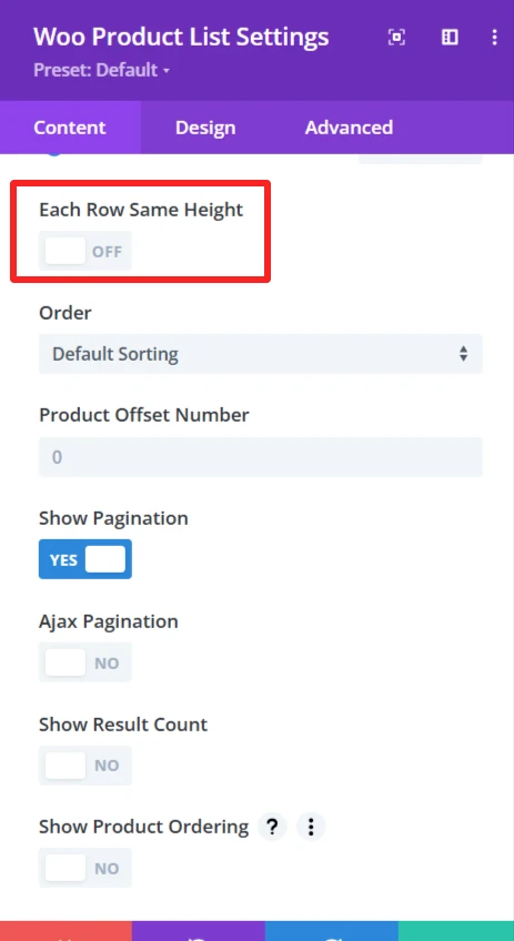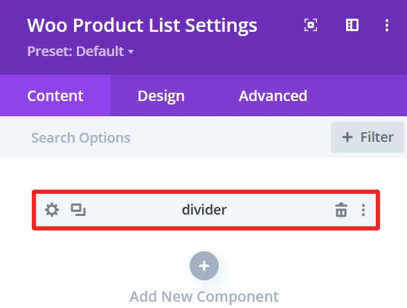 The Design tab in the Woo Product List module lets you customize how the product list appears on your site. You can adjust the look and feel of the list and its items.