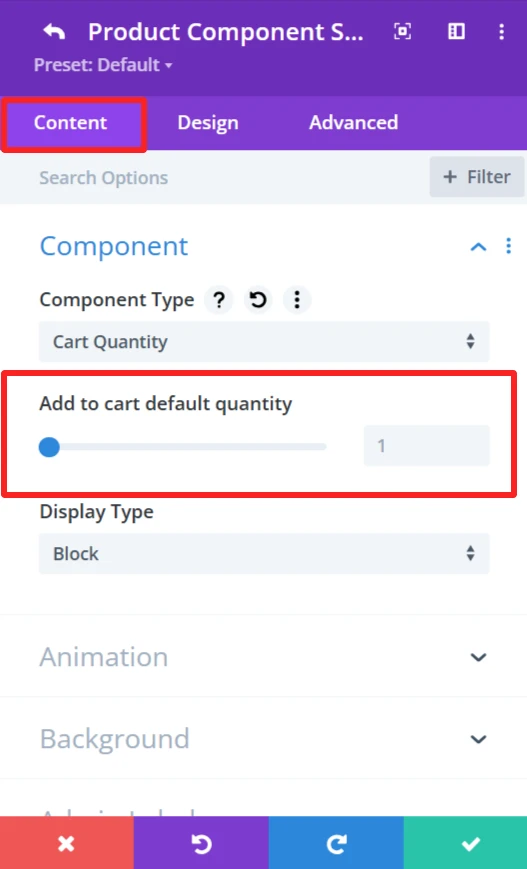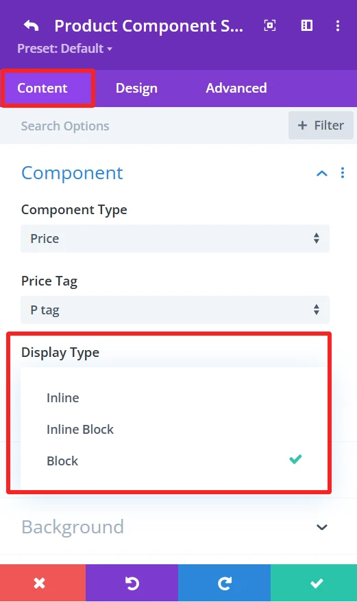 This element also has the following options: Display Type (Inline\ Inline Block\ Block), Animation (apply animation effects), Background (custom background).