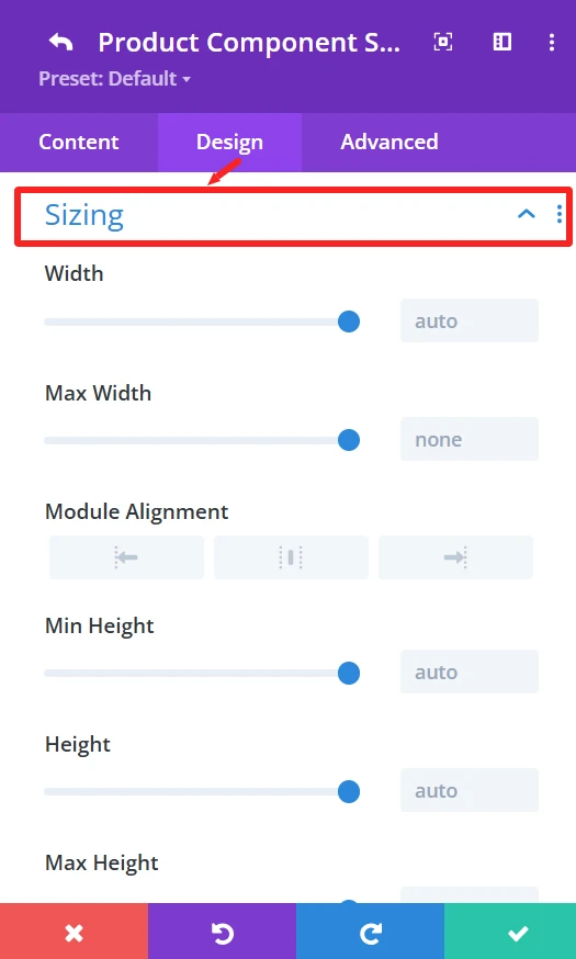 Sizing: This is where you control the size of your entire product list and your individual product items. You can make the items display in the list as big or small as you want.