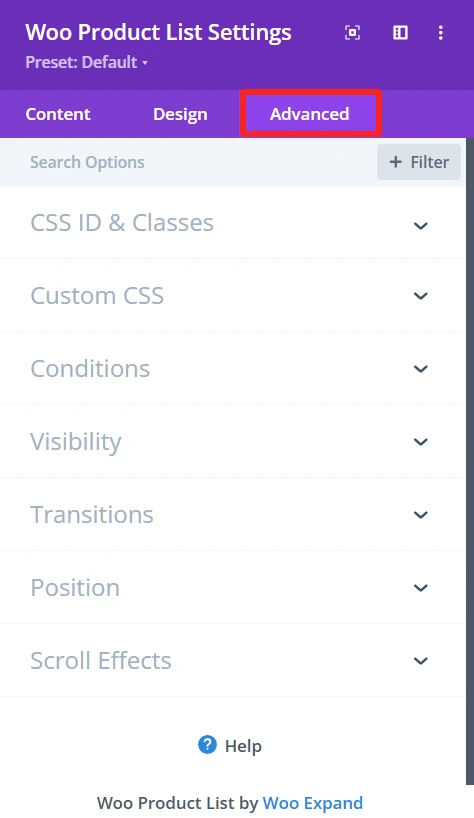 The Advanced section of the Woo Product list module offers more customization for those who’d like to have more control over the behaviour and visibility of the product list, as well as how the user will interact with it. These are mostly for those who know a bit of web development or who want to make fine-tuned adjustments. It offers options such as adding CSS IDs or classes, using its own custom CSS for design adjustments, and setting conditions for when the list is displayed.