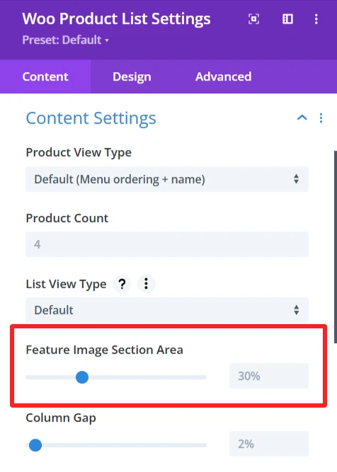 Default settings: 30% – This is a percentage to decide how much space the feature image will occupy in the product list.