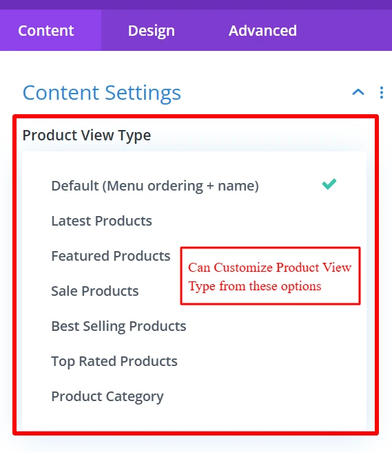 The content tab offers an extensive amount of options to control how products are displayed in the product list. This section is made to be customizable in layout and sorting.