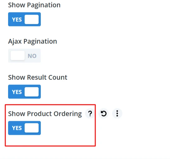 Customization options: If NO, the dropdown or buttons used to order the product are hidden, and the user isn’t able to change the order in which the products are shown!