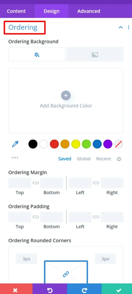 Ordering: it is used for customization of ordering background, margin, padding, rounded corners, and its broader style, width, color also used to give box shadow in ordering.