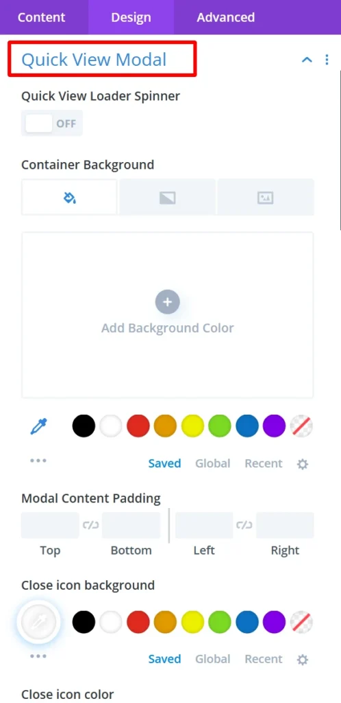 Quick View Modal Items: Set the items that are being displayed inside the quick view popup. You can display the product image, price, description, or any other optional information inside the modal.