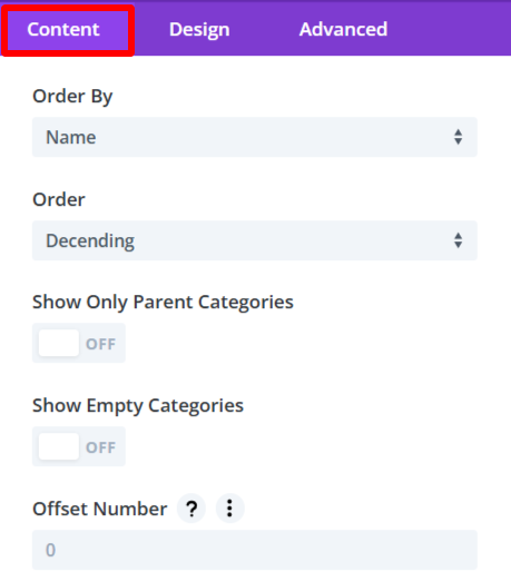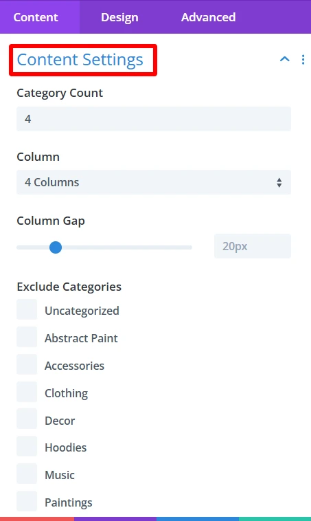 From the Content Settings, you can set the Category count, number of columns also you can exclude categories that you don’t need and many more.